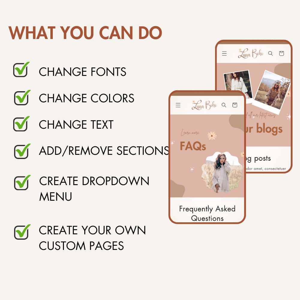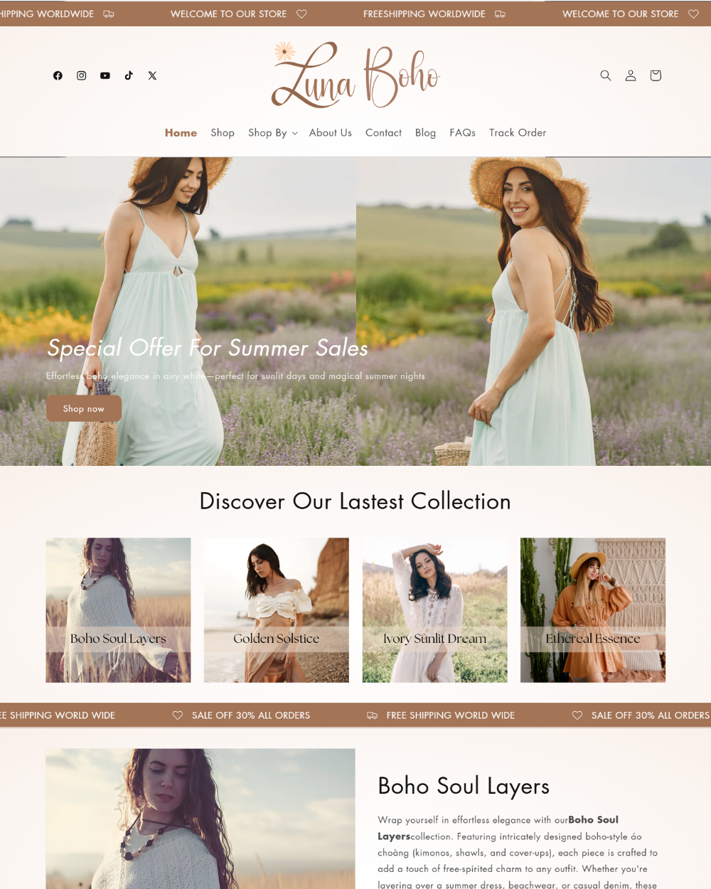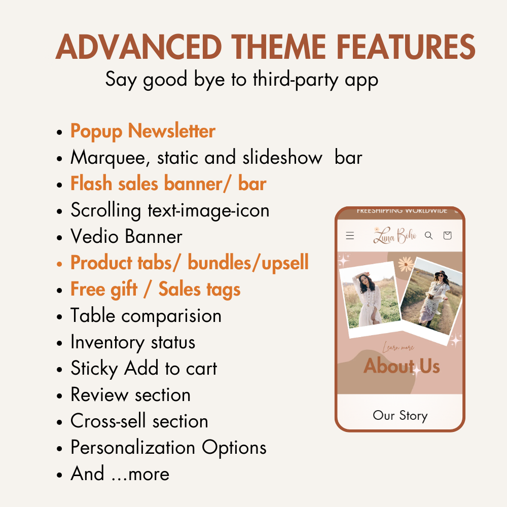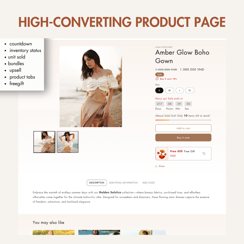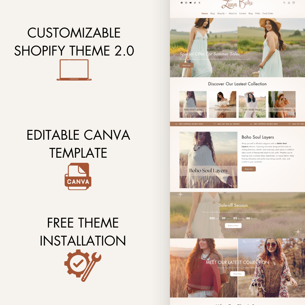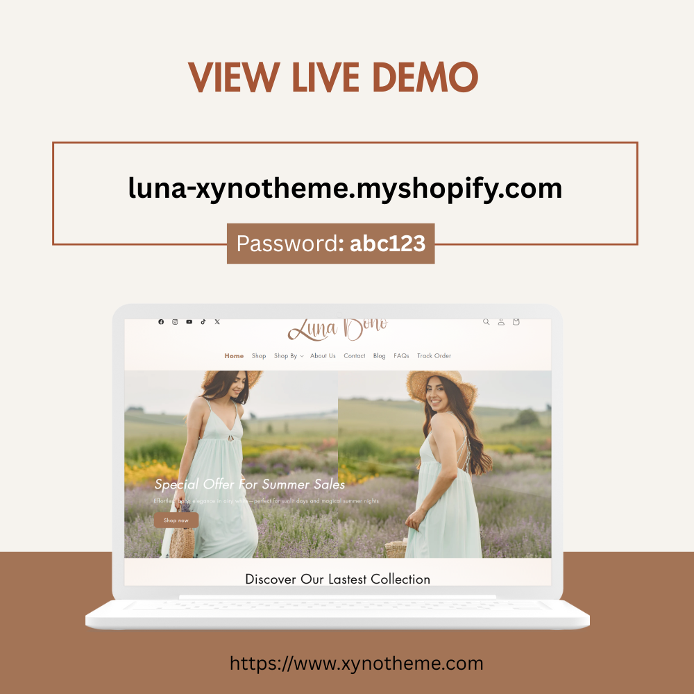 Luna by Xynotheme is a Shopify 2.0 theme designed for boho-style clothing boutiques, offering a free-spirited, stylish, and user-friendly experience. Effortlessly customize every element to reflect your brand’s unique aesthetic, creating a seamless and captivating shopping journey for boho fashion lovers. Beyond boho, this theme is also perfect for elegant fashion, home decor, and artisanal boutiques, giving your store a sophisticated yet warm and inviting look.